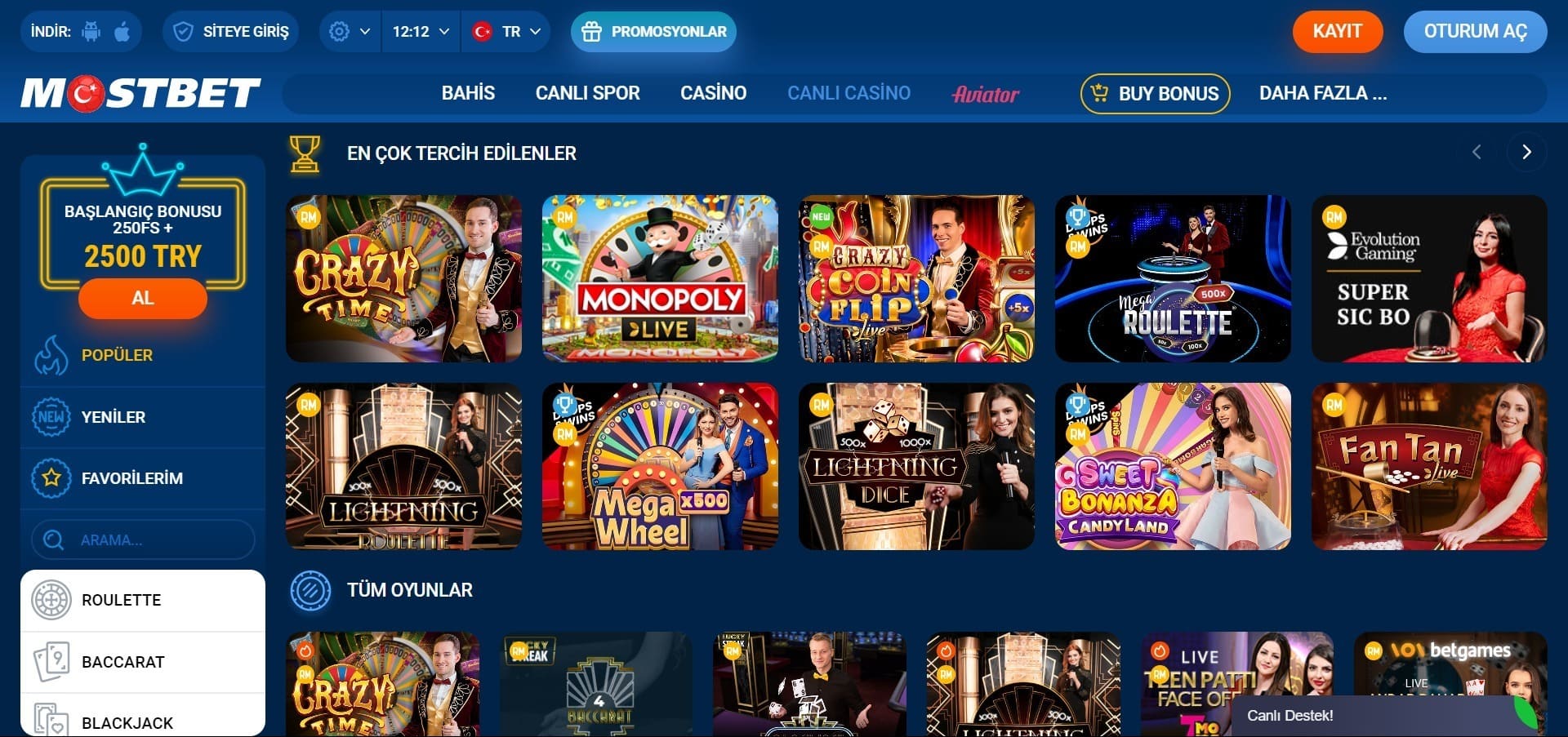 Mostbet Canlı Oyunlar real aparıcılarla əylənən və canlı yayımlanan video oyunlardır. Canlı video oyunlar müştərilərə öz evlərinin rahatlığından real onlayn kazino təcrübəsini yaşamağa imkan verir. Video oyunlarda yüksək keyfiyyətli video klip və interaktiv funksiyalar var. Çünki əlavə olaraq ev sahibləri ilə söhbət etmək və müxtəlif digər oyunçularla qarşılıqlı əlaqə qurmaq şansı var. Mostbet Live Casino Saytında məşhur oyunlar bunlardır: